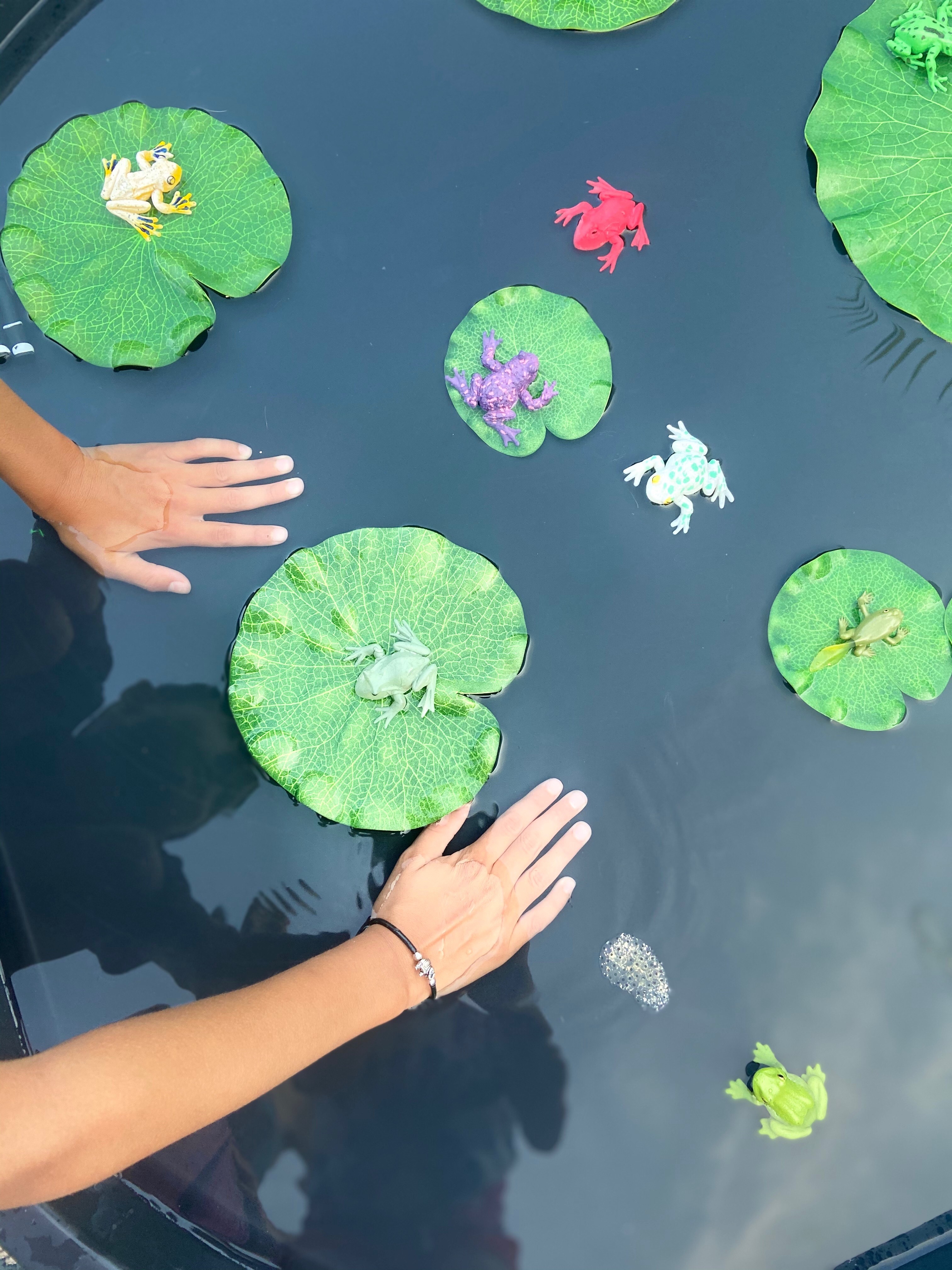 - Toss in the frogs and lily pads.