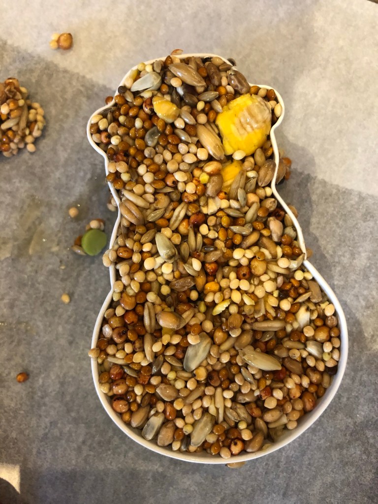 - Add 2 cups of birdseed to completely dissolved gelatin. Mix for 2 minutes to allow the seeds to soak up gelatin mixture.
