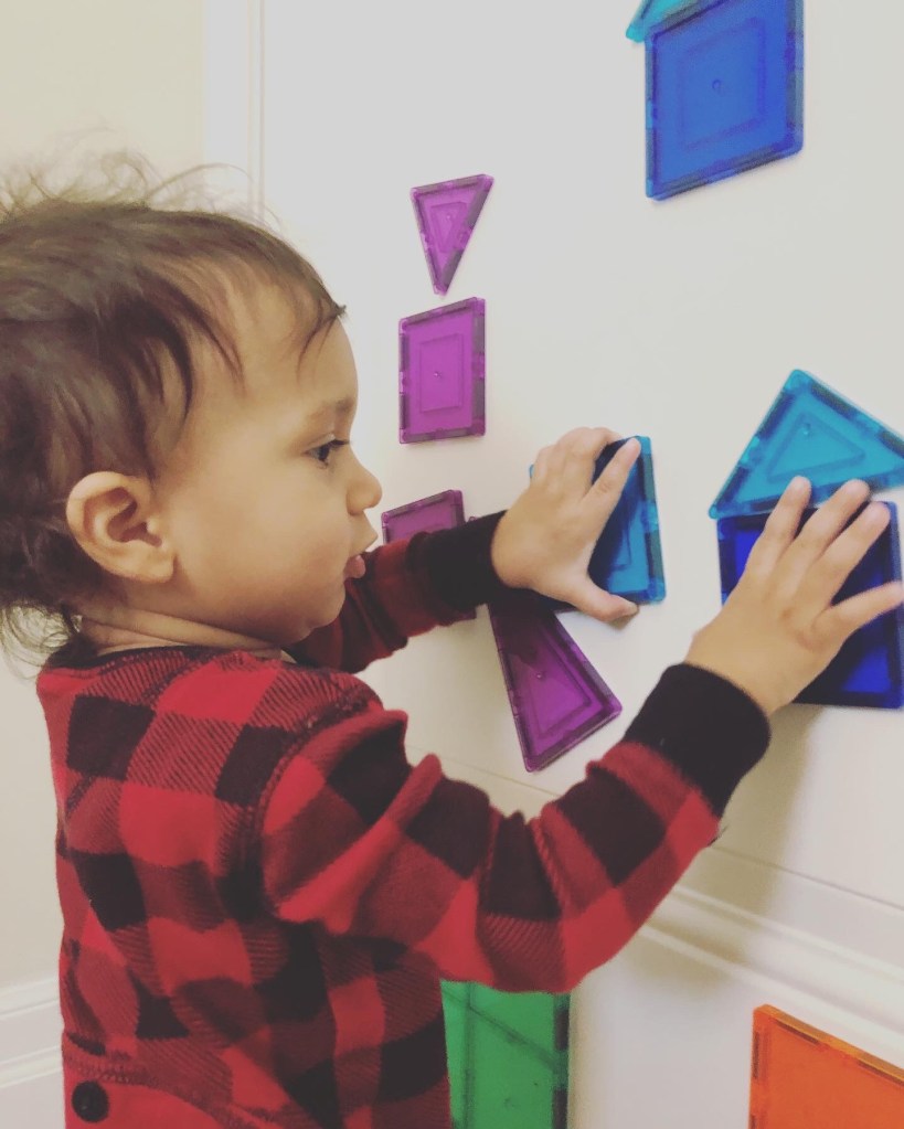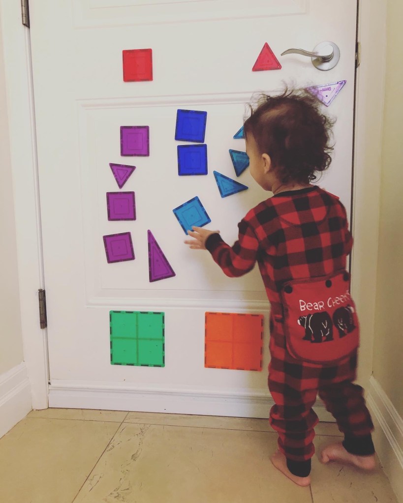 Allow children to stick the magnetic tiles to the door. Older children may create a picture. Smaller children will enjoy placing and removing the magnetic tiles.